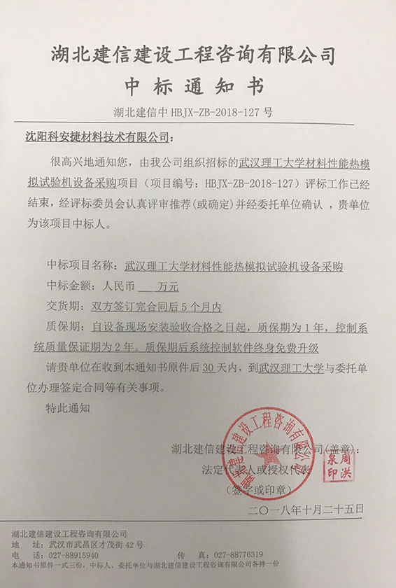 2018年9月29日,由湖北建信建设工程咨询有限公司对武汉理工大学材料性能热模拟试验机设备采购项目进行公开招标。我公司积极组织人员,通过各部门团结协作、高效率、高质量完成了投标文件的编制工作,并在本次公开招标中一举中标。